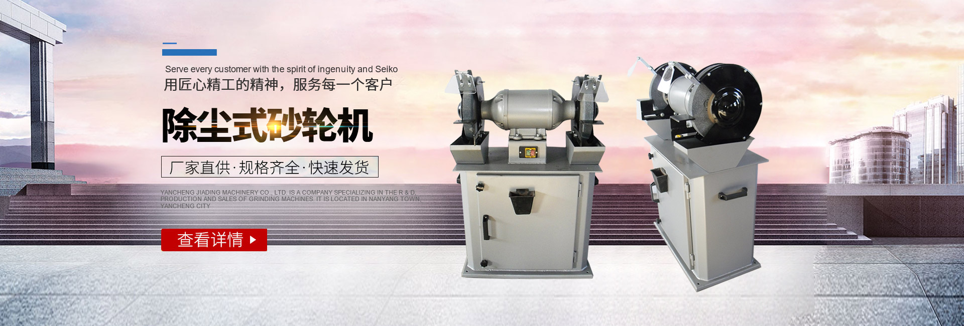 鹽城嘉鼎機械有限公司是一家專業(yè)從事砂輪機研發(fā)、生產(chǎn)、銷售為一體的公司,坐落在鹽城市南洋鎮(zhèn)。主要產(chǎn)品有:砂輪機、砂帶機等系列。其中砂輪機有:臺式、立式、懸掛式、除塵式、它驅(qū)式、防爆式等三十多個規(guī)格品種,也可定制特殊行業(yè)所需的異型砂輪機。